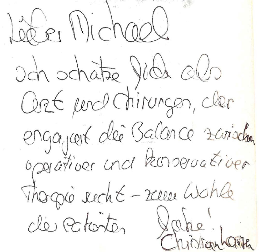 Lieber Michael, ich schätze Dich als Arzt und Chirurgen, der engagiert die Balance zwischen operativer und konservativer Therapie sucht - zum Wohle der Patienten.
